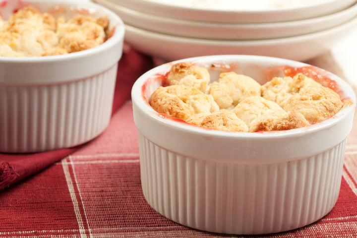 Frischer Erdbeer-Cobbler ist so schnell und einfach zu machen. Hacken Sie die Erdbeeren, mischen Sie den Teig, schichten Sie Ihre Ramekins und backen Sie 15 Minuten. Voila!