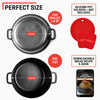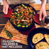 Die Silikonmatte und die Topflappen sind bis zu 230 °C hitzebeständig und schützen Ihre Hände und Arbeitsplatten vor Verbrennungen.